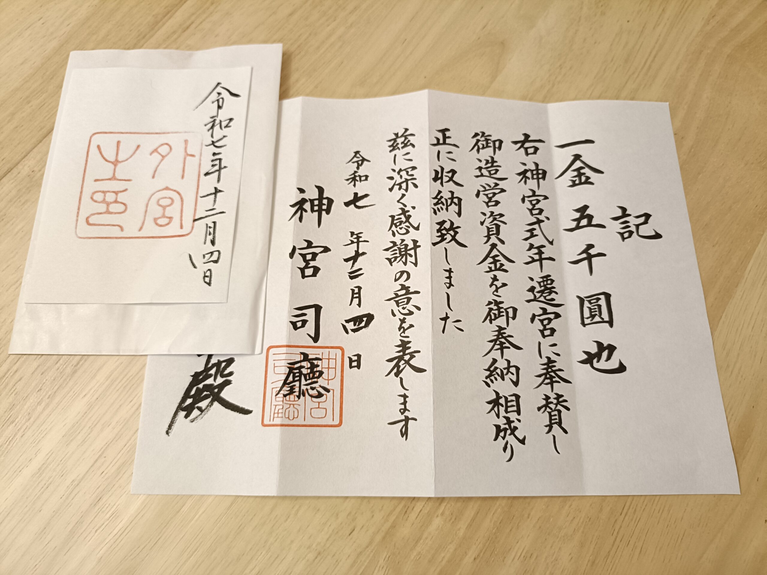 正式参拝は事前予約が不要で、当日受付をすれば、誰でも参列することができます。初穂料も決まった額はなく「お志」とされています。目安は二千円以上でしたので、私は五千円を納めました。また写真の左側にある御朱印も同じく「お志」で、五百円以上となっています。各々の志を大切にするところに、伊勢神宮らしさを感じます。
