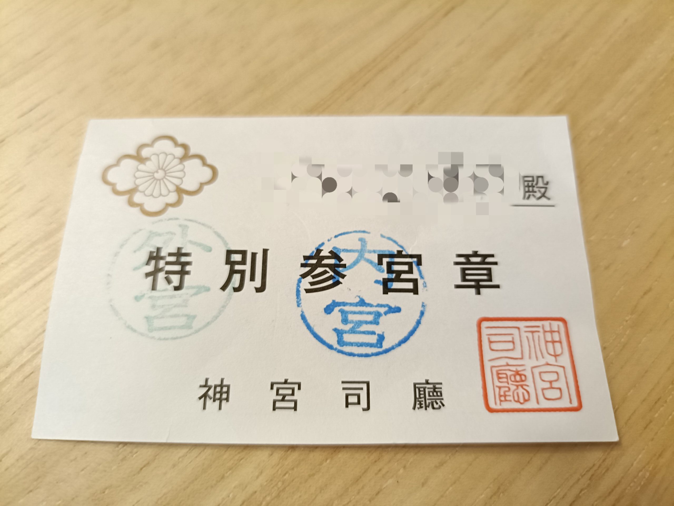 受付を済ませると、正式参拝用の特別参宮章(通行証のようなもの)をいただけます。1回受付を済ませると、外宮だけではなく内宮の正式参拝も行うことができますよ。